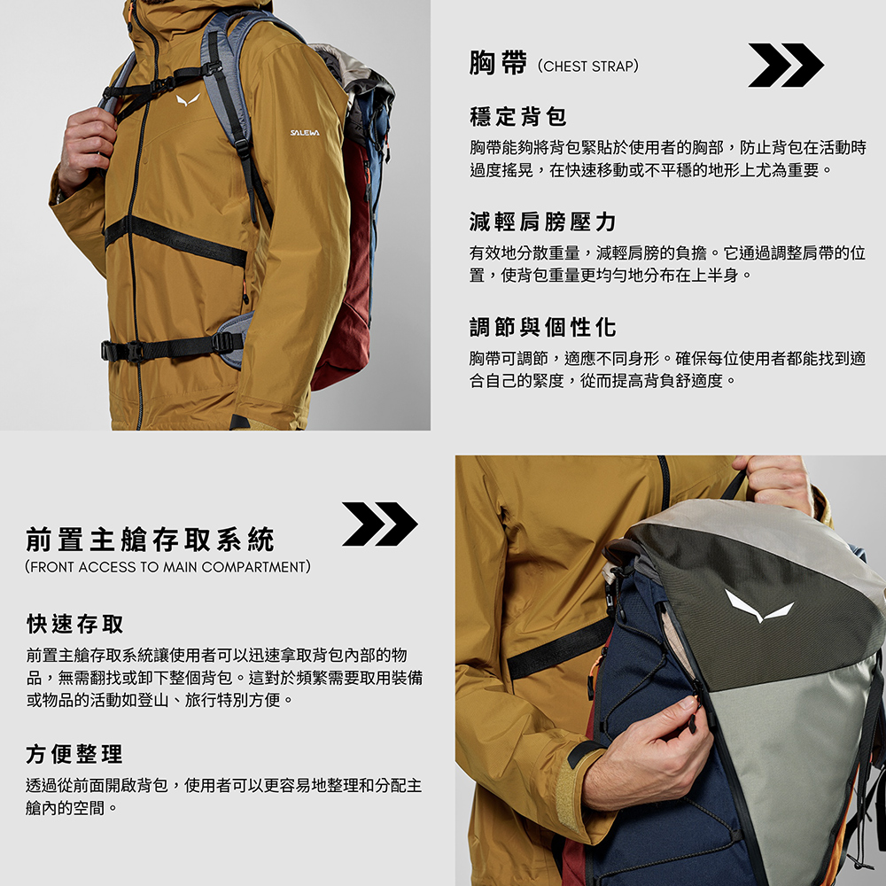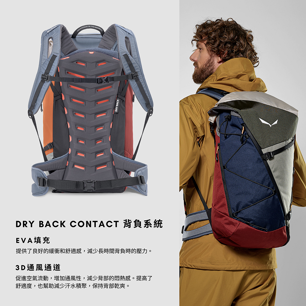 搭載 SALEWA 自家開發的 DRY BACK Contact 背負系統,採用氣流導向結構與減壓設計,讓你即使滿載也能輕鬆上山、保持背部乾爽! - ✅ 靈活收納空間