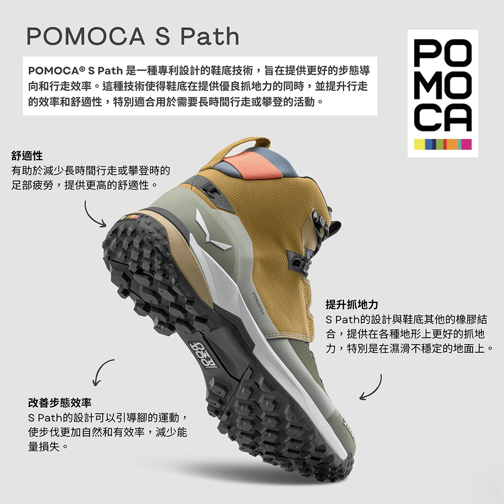 ✔ 鞋底搭載POMOCA® S Path 技術,具備優異的抓地力,同時優化步態過渡,提升行走效率與整體舒適度。